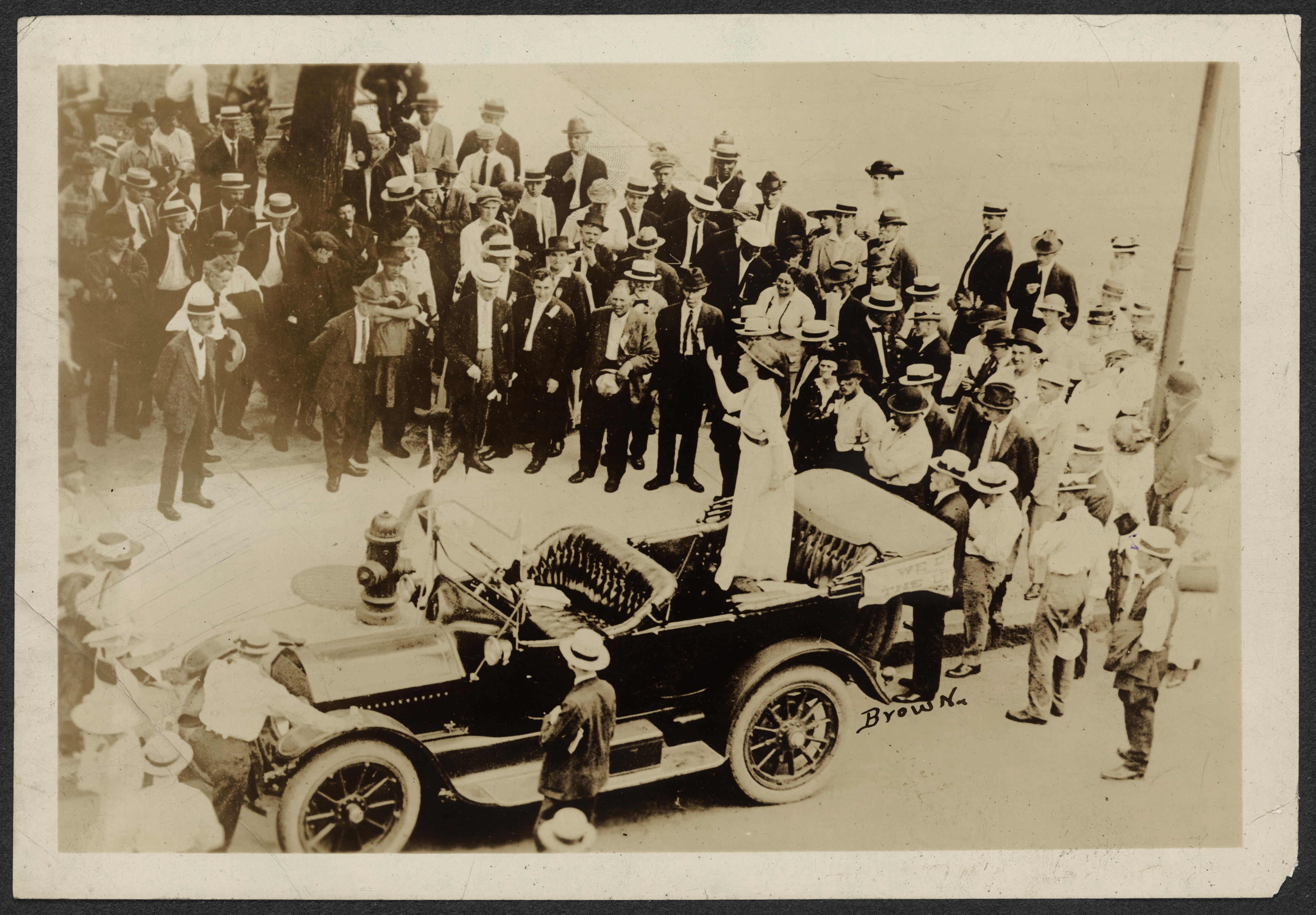 Elsie Hill speaks at a street meeting during a Prohibition Party convention that has endorsed a plank advocating a suffrage amendment, July 1916. Harris & Ewing, Library of Congress.